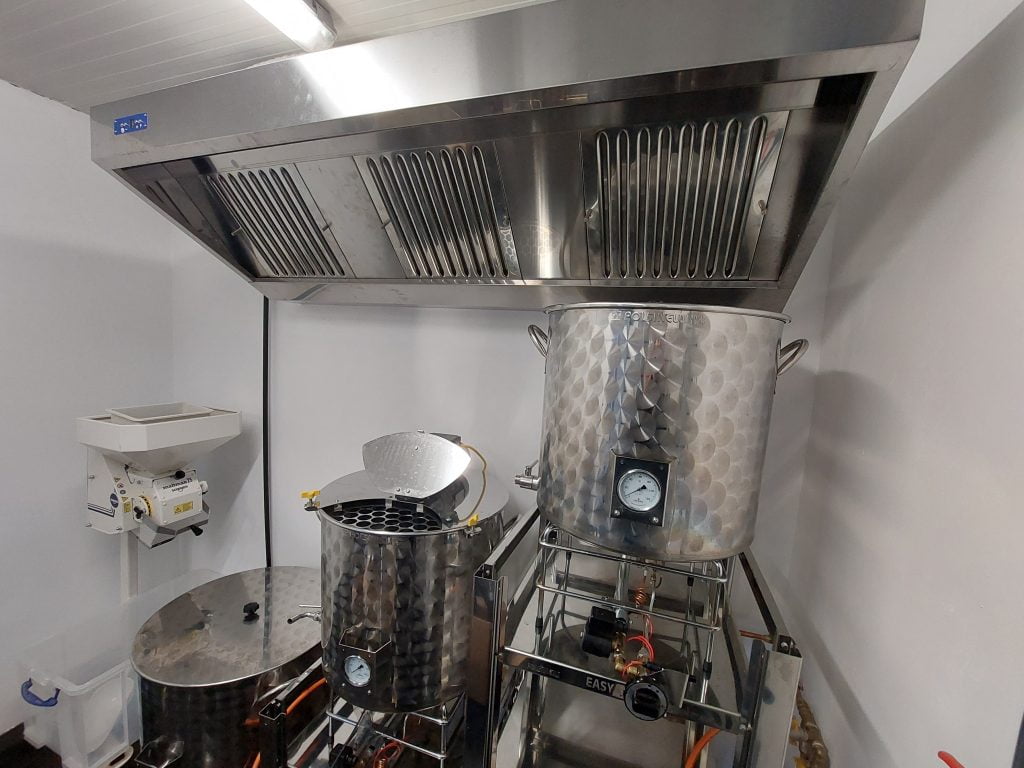 Bij de opstart heeft de brouwerij een totaal capaciteit van 2,9hl, met een totaal bottelvolume van om en bij de 2,5 hl. We werken met een 3 ketelsysteem. De kookketel heeft een volume 150l, de heetwatertank en de gemotoriseerde maichketel met roerwerk hebben een volume van 100l.
